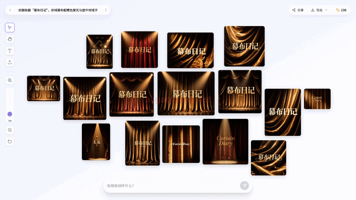 提示词:封面标题“幕布日记”,丝绒幕布配暖色聚光与居中衬线字。
