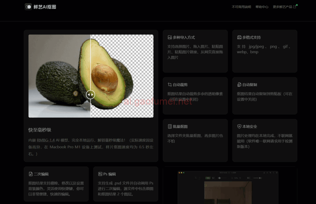 鲜艺AI抠图是一款功能强大的免费AI抠图工具,能快速去除图片背景,支持本地和在线图片处理。鲜艺AI抠图具备毫秒级处理速度、无需联网确保隐私安全、支持批量操作、多格式兼容,以及Photoshop二次编辑功能。用户界面简洁直观,支持皮肤和语言切换,支持Windows和macOS系统,广受创意工作者好评。