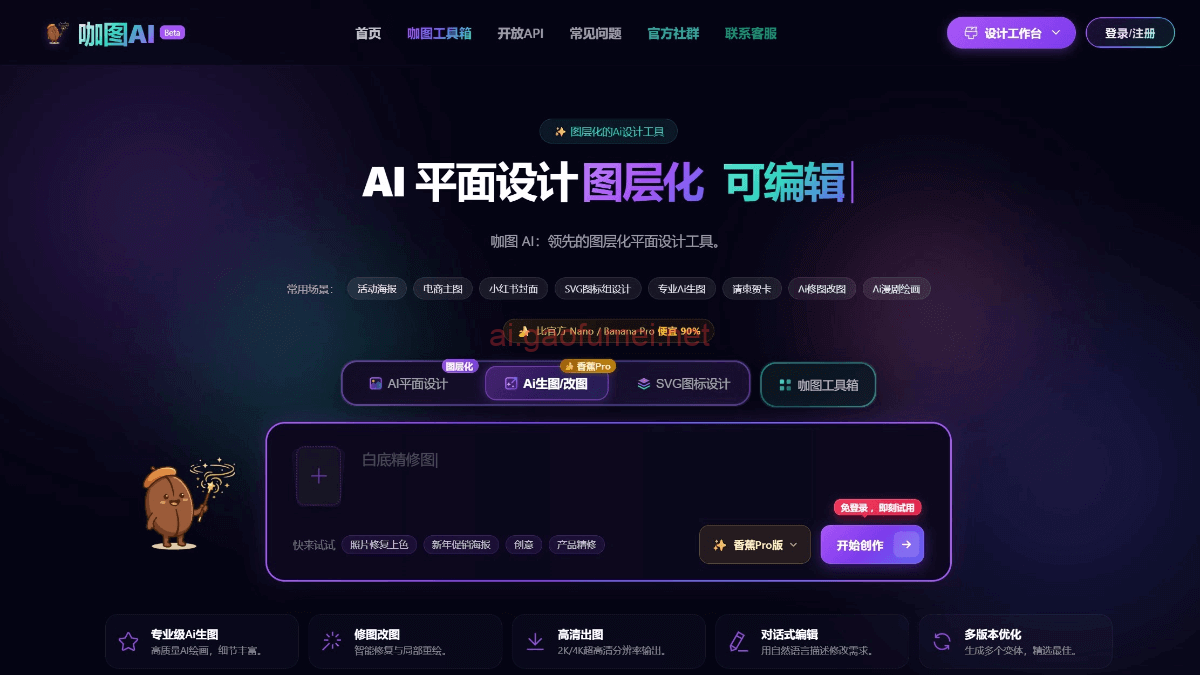 咖图AI是专业级AI图像设计平台,搭载NanoBanana Pro模型,解决传统AI出图后无法编辑的痛点。提供三大核心工作台:AI生图改图支持智能抠图、局部重绘和风格迁移;图层化海报封面设计实现元素独立编辑、批量产出与模板复用;SVG图标批量生成可一键产出风格统一的图标组并支持PNG转SVG。平台还配备咖图工具箱,覆盖电商修图、人像美化、趣味玩法等62个场景小工具。