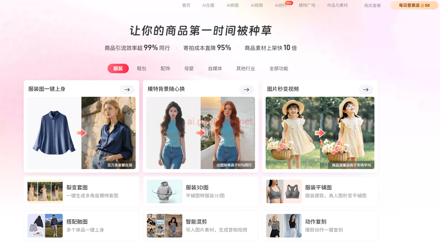 - AI图片处理:绘蛙提供一键美图、一键搞定设计、一键换装、一键去水印、图片高清修复等功能,帮助商家优化商品图片,提升视觉效果。