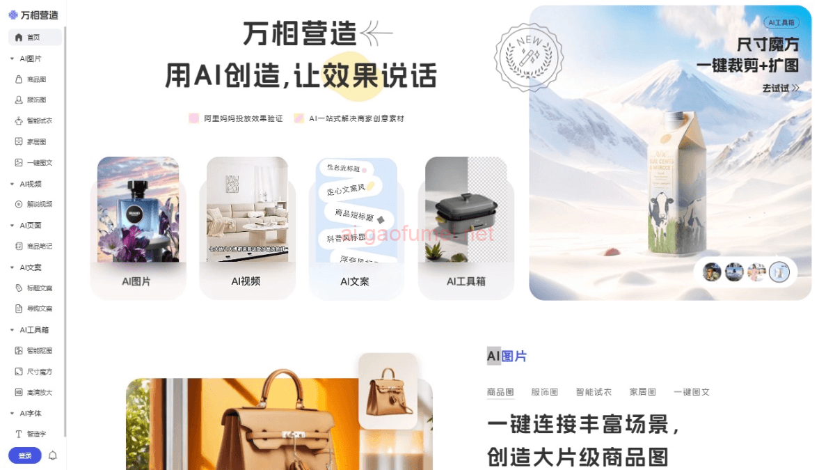 万相营造是阿里旗下推出的基于大模型技术进行多模态智能创意生成的平台,支持广告推广、运营、设计,根据既有的货品素材、营销运营诉求进行AI创意生成。用户可以根据需求,制作包括商品图、服饰模特图、服饰平铺图上身试穿、家居图、一键图文、营销文案、营销脚本及视频生成。同时提供设计师常用的多种AI工具能力,协助设计师快速完成扩图、抠图、图像高清处理等日常基础工作。